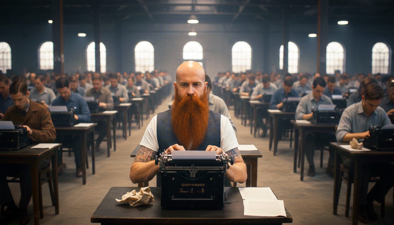 Hundreds of keys striking paper, each echoing across a cavernous warehouse in a top-secret location, fingers moving in manic yet precise choreography. It is, in every sense, absurdly theatrical.